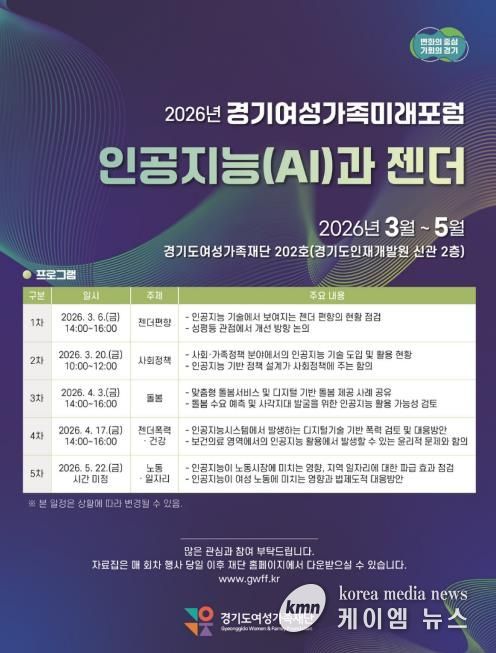 (케이엠뉴스) 인공지능 시스템이 기존 성별 역할 구조와 사회적 차별을 재생산하거나 강화할 수 있다는 우려가 제기되는 가운데 경기도여성가족재단이 5월까지 ‘인공지능(AI)과 젠더’를 주제로 경기여성가족미래포럼을 개최한다.