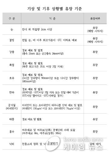 이번 휴장 매뉴얼은 적설·결빙·강풍·폭염·한파·미세먼지·태풍·낙뢰 등 다양한 기상 상황에 대해 휴장 기준과 대응 절차를 구체화한 것으로, 현장 판단에 따른 혼선을 줄이고 일관된 운영 기준을 적용하는 데 목적이 있다.