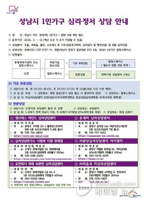 (케이엠뉴스) 성남시는 우울감이나 외로움, 불안감, 스트레스로 어려움을 겪는 1인 가구에 전문적인 심리·정서 상담을 지원한다고 5일 밝혔다.