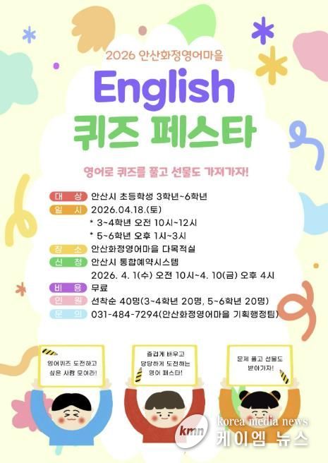 (케이엠뉴스) 안산시가 설립하고 안산대학교가 운영하는 안산화정영어마을은 4월 1일부터 4월 10일까지 원어민과 함께하는 ‘English 퀴즈 페스타’ 참가자를 선착순 모집한다고 5일 밝혔다.