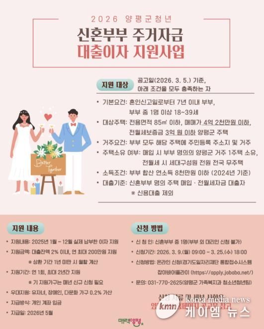 (케이엠뉴스) 양평군은 주택 매입 또는 임차(전월세) 자금 대출을 받은 양평군 거주 청년 신혼부부를 대상으로 연간 최대 200만 원의 대출이자를 지원하는 ‘2026년 양평군 청년 신혼부부 주거자금 대출이자 지원 사업’을 시행한다고 5일 밝혔다.