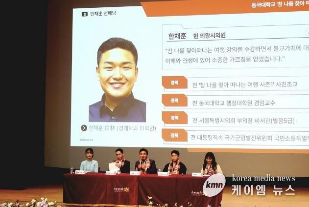 (케이엠뉴스) 한채훈 의왕시의회 의원이 지난 3일 오후 모교인 동국대학교에서 열린 건학 120주년 기념 특별 강좌 ‘참 나를 찾아 떠나는 여행’의 첫 번째 멘토로 나서 420여 명의 후배들에게 도전과 희망의 메시지를 전했다.