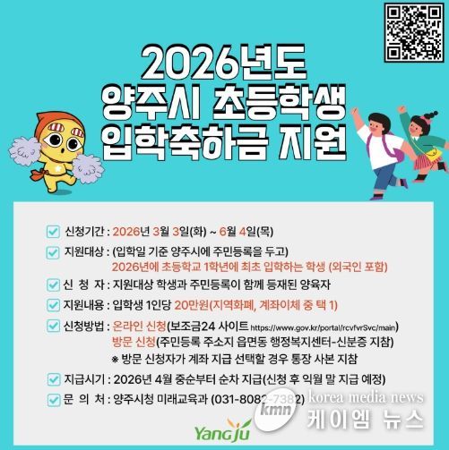 (케이엠뉴스) 양주시가 지역 내 초등학교 1학년에 입학하는 신입생 가정의 교육비 부담을 경감하고 교육복지 실현을 위해 ‘2026년 초등학교 입학축하금 지원사업’을 추진한다.