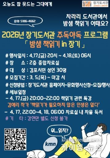 (케이엠뉴스) 김포시 장기도서관은 시민들이 책과 함께 특별한 밤을 보낼 수 있도록 오는 4월 17일 오후 8시부터 다음날인 4월 18일 오전 6시까지 도서관에서 자율적으로 독서를 하는 '밤샘 책읽기 인(in) 장기' 프로그램을 진행한다.