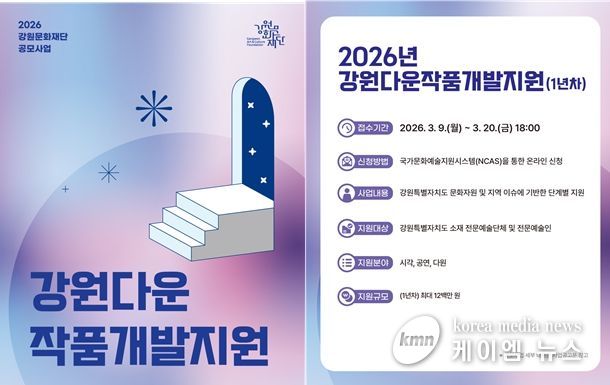 (케이엠뉴스) 강원문화재단은 강원을 대표할 창작 콘텐츠 발굴을 위해 '2026 강원다운작품개발지원사업(1년차)' 공모 접수를 9일부터 시작한다.