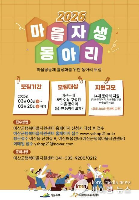 (케이엠뉴스) 예산군행복마을지원센터는 마을에 활력을 불어넣고 마을공동체 회복을 도모하기 위해 2026년 마을자생동아리를 3월 20일까지 모집한다고 밝혔다.