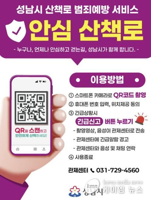 (케이엠뉴스) 성남시는 시민들이 보다 안심하고 산책로를 이용할 수 있도록 영장산과 불곡산 일대 산책로에 ‘범죄예방 서비스’를 6일부터 도입한다.