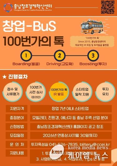 (케이엠뉴스) (재)충남창조경제혁신센터가 지역 내 유망 스타트업의 신속한 발굴과 실질적인 투자 유치를 지원하기 위해 2026 창업-BuS ‘100번가의 톡’ 프로그램에 참여할 기업을 상시 모집한다고 밝혔다.