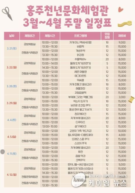 (케이엠뉴스) 홍성군 홍주천년문화체험관은 다가오는 봄을 맞아 오는 21일부터 4월 26일까지 매주 주말마다 다채로운 주말 체험 프로그램을 운영한다고 밝혔다.