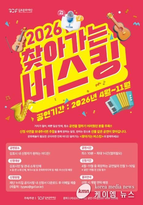 (케이엠뉴스) (재)김포문화재단은 시민들의 일상 속 문화예술 향유 기회 확대를 위한 ‘2026 찾아가는 버스킹’ 공연 관람 희망 단체를 모집한다고 밝혔다.