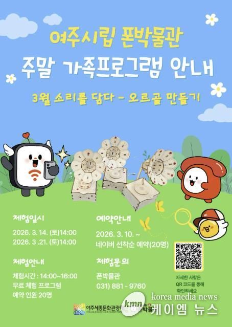 (케이엠뉴스) 여주세종문화관광재단 여주시립 폰박물관은 2026년 3월부터 11월까지 매월 주말 가족체험 프로그램을 운영하며, 3월 체험 프로그램 '소리를 담다 – 오르골 만들기' 참여자를 모집한다.
