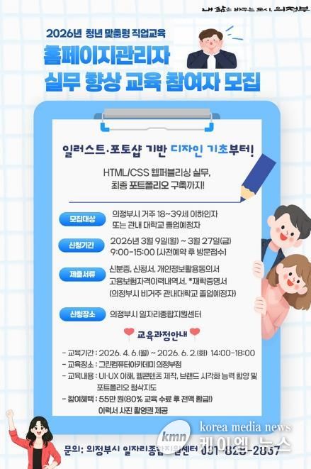 (케이엠뉴스) 의정부시는 사회에 첫발을 내딛는 청년과 전직 희망자를 위해 4월 6일부터 6월 2일까지 9주간 ‘홈페이지 관리자 실무 향상 교육’을 운영한다.