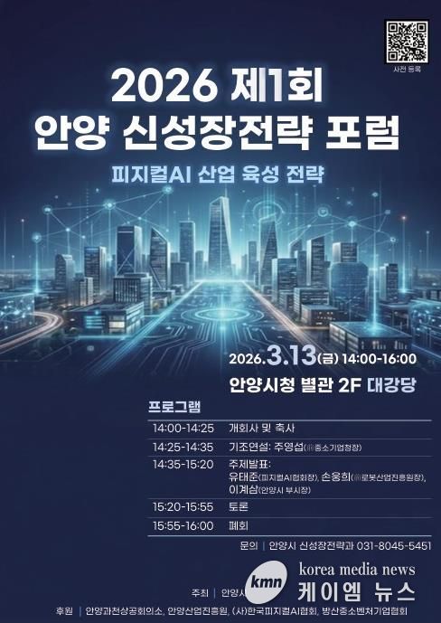 (케이엠뉴스) 안양시는 미래 신산업 육성과 지역 산업 경쟁력 강화를 모색하기 위한 ‘2026 제1회 안양 신성장전략 포럼’을 이달 13일 오후 2시 안양시청 별관 2층 대강당에서 개최한다고 9일 밝혔다.