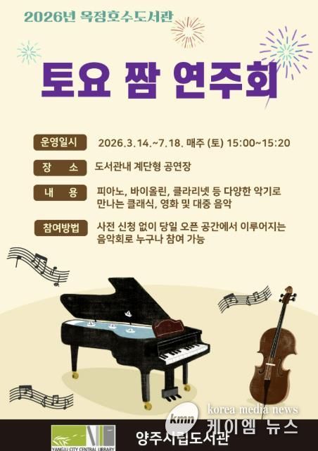(케이엠뉴스) 양주시 옥정호수도서관이 오는 3월 14일부터 7월 18일까지 시민들이 일상 속에서 음악을 즐길 수 있도록 ‘토요 짬 연주회’를 진행한다.