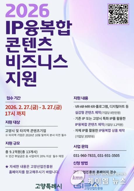 (케이엠뉴스) 고양특례시와 고양산업진흥원이 오는 3월 27일까지 ‘IP융복합 콘텐츠 비즈니스 지원사업’에 참여할 기업을 모집한다.