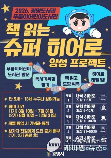 (케이엠뉴스) 광명시 광명도서관은 10일부터 푸름이어린이도서관에서 어린이 독서 장려를 위한 ‘책 읽는 슈퍼 히어로(Hero)’ 양성 프로젝트를 운영한다.