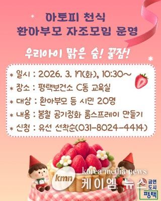 (케이엠뉴스) 평택시는 알레르기 질환으로부터 안전한 지역사회 환경을 조성하기 위해 오는 17일 오전 10시 30분, 평택보건소(C동) 교육실에서 ‘아토피·천식 환아 부모 자조모임’을 운영한다고 밝혔다.