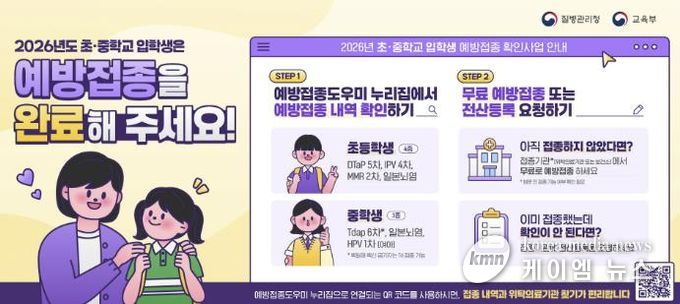 초등학교 입학생은 △DTaP 5차 △폴리오 4차 △MMR 2차 △일본뇌염 등 4종의 접종 완료 여부를 확인해야 하며, 중학교 입학생은 △Tdap(또는 Td) 6차 △일본뇌염 △HPV 1차(여학생) 등 3종의 접종 여부를 확인해야 한다.