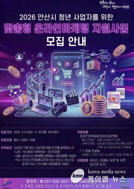 (케이엠뉴스) 안산시는 온라인 시장에서 상품 홍보와 매출 확대를 희망하는 청년 사업자를 대상으로 ‘맞춤형 온라인마케팅 지원사업’ 참여자를 모집한다고 11일 밝혔다.