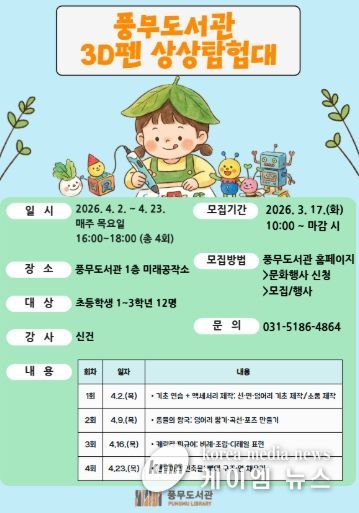 (케이엠뉴스) 김포시 풍무도서관은 초등학생 1~3학년을 대상으로 ‘3차원 펜 상상탐험대’를 오는 4월 2일부터 4월 23일까지 매주 목요일 오후 4시부터 6시까지 총 4회에 걸쳐 운영한다.
