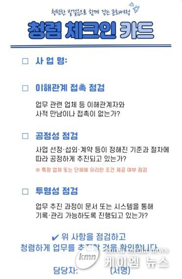 체크인 카드에는 ▲이해관계자와의 사적 접촉 여부 ▲사업 추진 과정의 공정성 ▲부당청탁 발생 여부 ▲업무 추진 과정의 기록 및 관리 가능 여부 등 업무 추진 시 점검해야 할 청렴 항목이 포함돼 있으며, 담당자가 업무 시작 단계에서 간단히 확인하도록 구성됐다. 특히 문화관광 분야는 민간단체 및 업체와의 협업이 많은 만큼, 이번 시책을 통해 업무 초기 단계에서 청렴 위험 요소를 점검함으로써 부패 발생 가능성을 사전에 예방하는 데 목적이 있다.