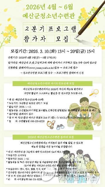(케이엠뉴스) 예산군청소년복지재단 소속 예산군청소년수련관은 관내 청소년의 건강한 성장 지원과 자기주도적 역량 강화를 위해 2026년 2분기 청소년 프로그램 참가자를 모집한다고 밝혔다.