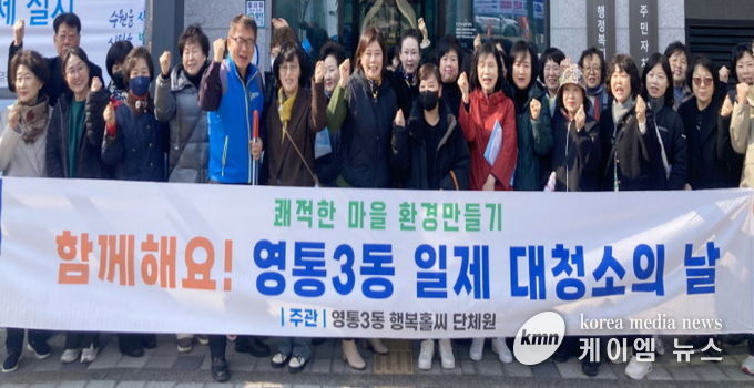 (케이엠뉴스) 수원시 영통구 영통3동 행정복지센터는 지난 12일 새봄을 맞아 쾌적하고 깨끗한 마을 환경 조성을 위해 통장협의회와 함께 ‘새봄맞이 일제 대청소의 날’을 실시했다.