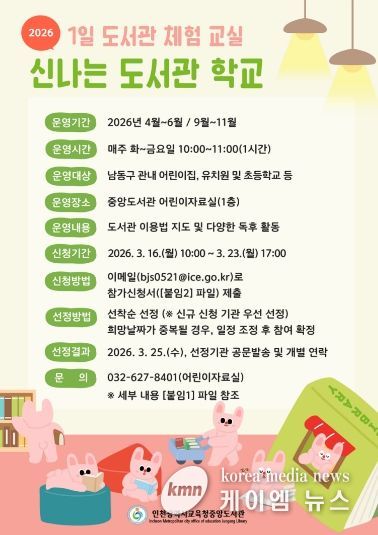 (케이엠뉴스) 인천광역시교육청중앙도서관은 오는 16일부터 남동구 관내 어린이집, 유치원 및 초등학교를 대상으로 1일 도서관 체험교실 ‘신나는 도서관 학교’ 참여 기관을 모집한다.