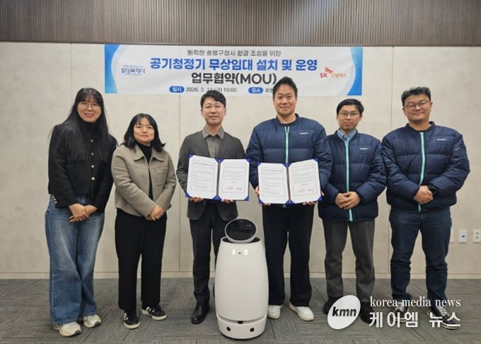 (케이엠뉴스) 화성특례시 효행구가 13일 SK인텔릭스와 ‘공기청정기 무상임대 설치 및 운영 업무협약(MOU)’을 체결하고 청사 내 실내 공기질 개선을 위한 인공지능(AI) 자율주행 공기청정기를 설치했다. 이번 협약은 지난 2월 개청한 효행구청사가 시민들에게 미세먼지 걱정 없는 쾌적한 행정 공간을 제공하기 위해 마련됐다.
