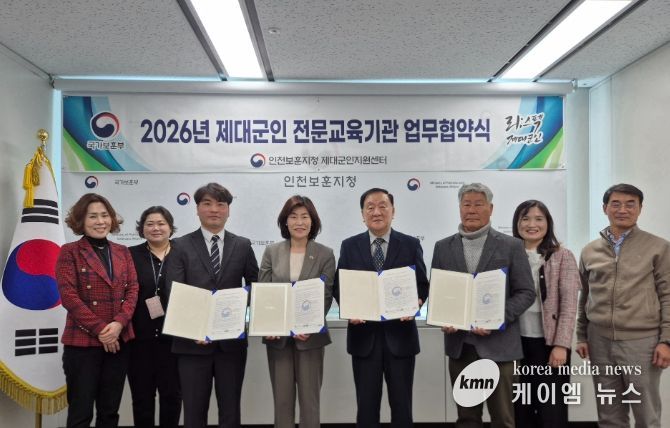 (케이엠뉴스) 국가보훈부 인천보훈지청 제대군인지원센터는 2026년 3월 13일 정부인천지방합동청사에서 사)대한민국항공보안협회 민간경비교육원 등 3개 교육기관과 2026년도 제대군인 전문위탁교육 업무협약을 체결했다.