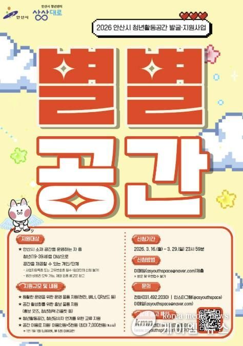 (케이엠뉴스) 안산시는 안산시 청년센터 상상대로를 통해 안산시 생활밀착형 청년활동공간 발굴 지원사업 ‘별별공간’ 참여자를 모집한다고 16일 밝혔다.