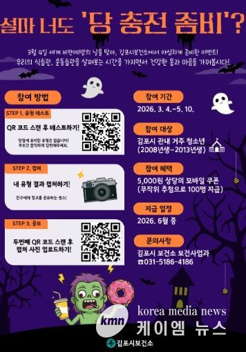 (케이엠뉴스) 김포시는 3월 4일 ‘세계 비만 예방의 날’을 기념해 관내 청소년들의 올바른 생활 습관 형성과 자기주도적 건강관리를 돕기 위한 ‘참여형 모바일 캠페인’을 오는 5월 10일까지 운영한다고 밝혔다.