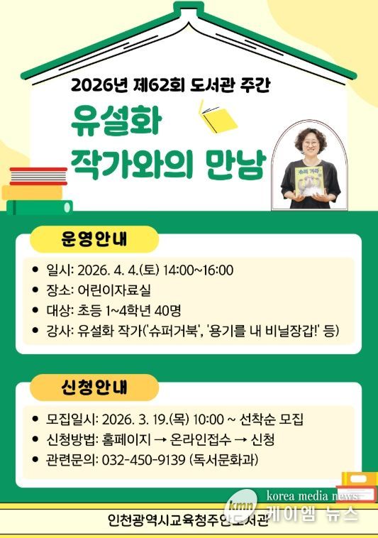 (케이엠뉴스) 인천광역시교육청주안도서관은 어린이가 작가와 소통하며 그림책을 깊이 이해하고 독서의 즐거움을 느낄 수 있도록, 오는 4월 4일부터 초등 1~4학년 학생을 대상으로 ‘유설화 작가와의 만남’을 개최한다.