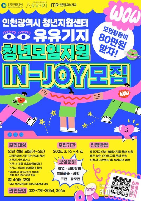 (케이엠뉴스) 인천테크노파크(인천TP)는 인천광역시 청년지원센터 ‘유유기지’에서 운영하는 ‘청년모임지원(IN-JOY)’ 프로그램에 참여할 40개 팀을 다음 달 6일까지 모집한다고 밝혔다.