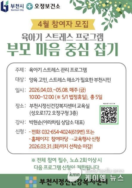 (케이엠뉴스) 부천시와 부천시정신건강복지센터(센터장 윤현철)는 자녀 양육으로 스트레스 관리가 필요한 부천시민을 위해 4월 3일부터 5월 8일까지 심리교육과 집단상담 프로그램을 운영한다.
