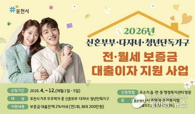 (케이엠뉴스) 포천시는 ‘2026년 신혼부부·다자녀·청년가구 전월세 보증금 대출이자 지원사업’을 추진한다.