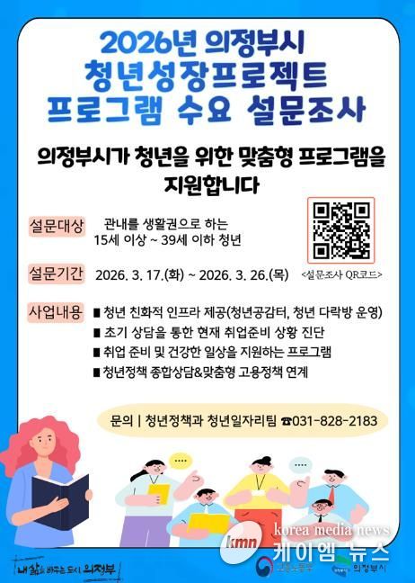 (케이엠뉴스) 의정부시는 청년들의 취업 준비 과정에서 필요한 프로그램을 파악하고 사업 운영에 반영하기 위해 청년성장프로젝트 프로그램 수요조사를 실시한다.