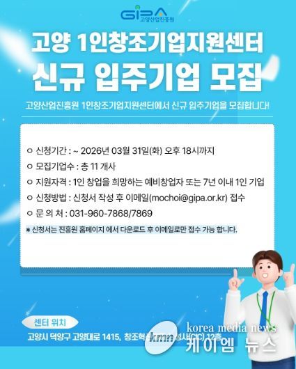 (케이엠뉴스) 고양산업진흥원이 ‘고양 1인 창조기업 지원센터’ 2026년 1차 신규 입주기업을 모집한다.