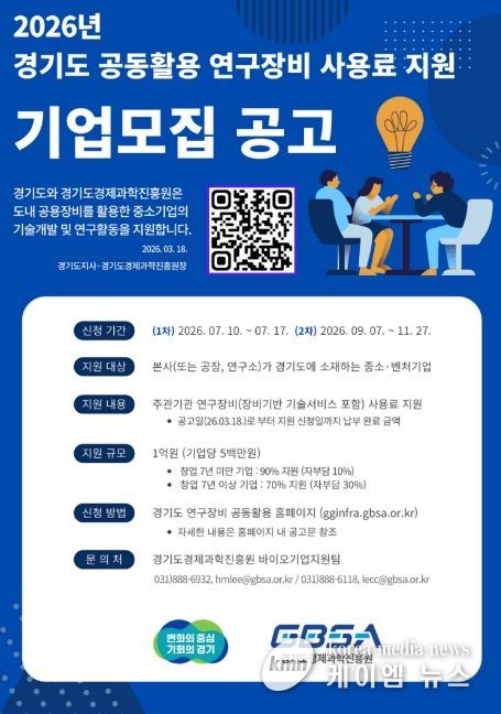 (케이엠뉴스) 경기도와 경기도경제과학진흥원이 도내 중소·벤처기업의 연구개발(R&D) 경쟁력 강화를 위해 ‘2026년 경기도 공동활용 연구장비 사용료 지원 사업’을 추진한다.