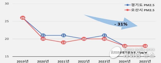 시에 따르면 오산시의 초미세먼지 연평균 농도는 2019년 이후 경기도 평균 수준을 유지하고 있으며, 보다 쾌적한 대기환경 조성을 위해 지속적인 관리와 개선 노력을 이어가고 있다. 시는 2026년 초미세먼지 연평균 농도 17㎍/㎥ 달성을 목표로 총력을 기울일 방침이다.