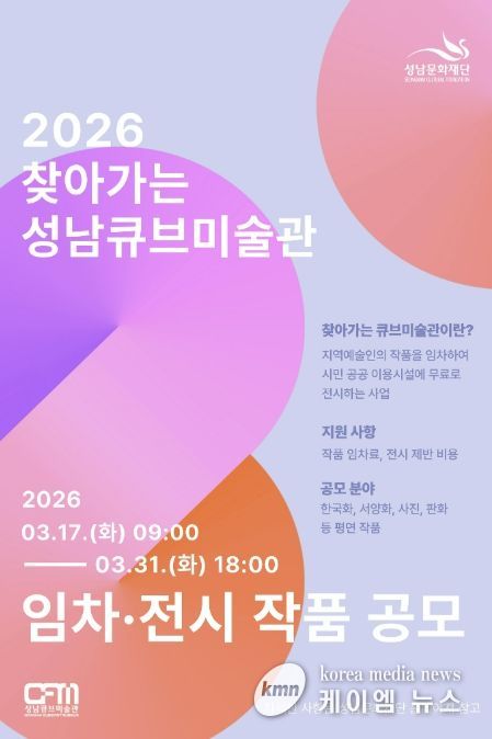 (케이엠뉴스) 성남문화재단은 지역예술인의 창작 환경 지원을 다각화하고 시민들의 문화예술 향유기회를 확대하고자 ‘2026 찾아가는 성남큐브미술관’ 작품 임차 공모를 진행한다.
