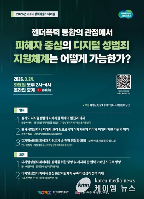(케이엠뉴스) 경기도와 경기도젠더폭력통합대응단은 24일 오후 2시 ‘젠더폭력 통합의 관점에서 피해자 중심의 디지털 성범죄 지원체계는 어떻게 가능한가?’라는 주제로 2026년 제1차 정책라운드테이블을 개최한다.