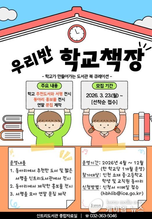 (케이엠뉴스) 인천광역시교육청신트리도서관은 인천 관내 중·고등학교를 대상으로 ‘우리반 학교책장’ 의 참가 동아리를 3월 23일부터 모집한다.