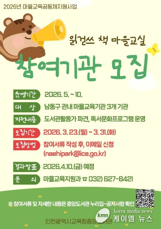 참여를 희망하는 기관은 3월 23일부터 31일까지 이메일로 신청 가능하며, 자세한 내용은 중앙도서관 누리집 공지사항을 확인하거나 마을교육지원과로 문의하면 된다.
