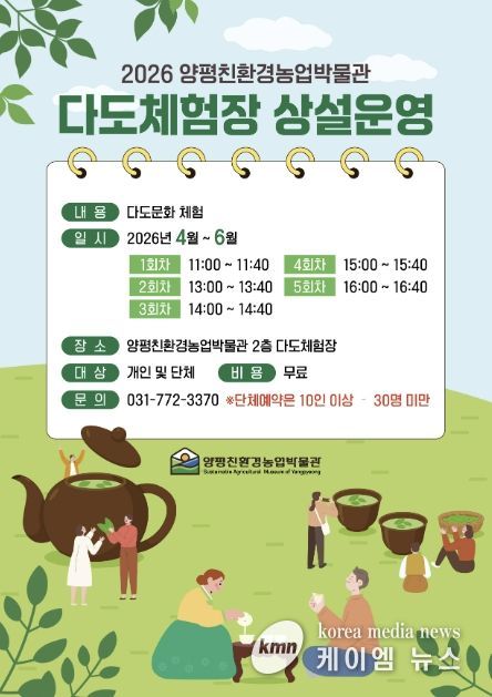 (케이엠뉴스) 양평친환경농업박물관은 오는 4월부터 6월까지 박물관 2층 다도체험장에서 상반기 다도체험 프로그램을 운영한다고 밝혔다.
