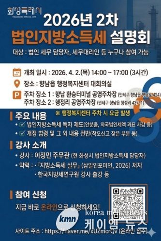 (케이엠뉴스) 화성특례시 만세구청이 지난 1차 설명회의 뜨거운 관심에 힘입어, 오는 4월 2일 오후 2시 향남읍 행정복지센터에서 ‘2차 법인지방소득세 설명회’를 개최한다.