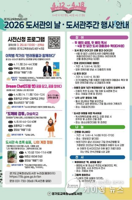 (케이엠뉴스) 경기도교육청성남도서관이 2026년 도서관의 날(4월 12일)과 도서관 주간(4월 12일~18일)을 맞아 다양한 독서·문화행사를 운영한다.