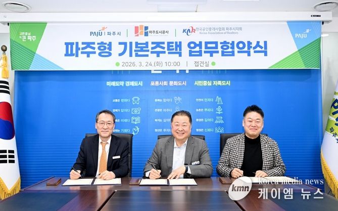 (케이엠뉴스) 파주시는 지난 24일 파주도시공사, 한국공인중개사협회 파주시지회와 함께 ‘파주형 기본주택’전세임대사업의 원활한 추진을 위한 업무협약을 체결했다.