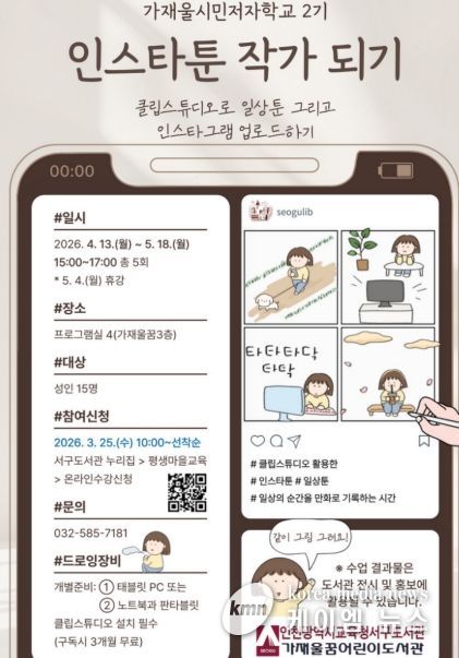 (케이엠뉴스) 인천광역시교육청서구도서관은 지역 주민의 창작 활동을 지원하기 위해, 25일부터 가재울 시민저자학교 2기 프로그램인 ‘인스타툰 작가되기’ 참여자를 모집한다.