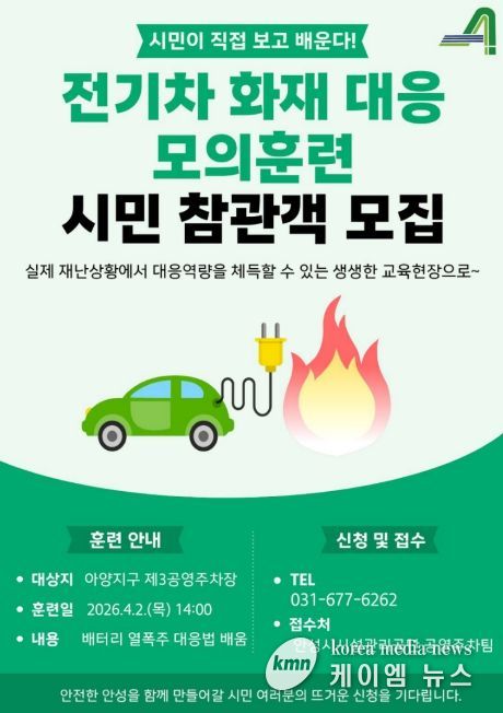 (케이엠뉴스) 안성시시설관리공단은 오는 4월 2일 목요일 오후2시 안성시 옥산동 소재 아양지구 제3공영주차장에서 ‘시민과 함께하는 2026년 재난대응 모의훈련’을 실시한다고 밝혔다.